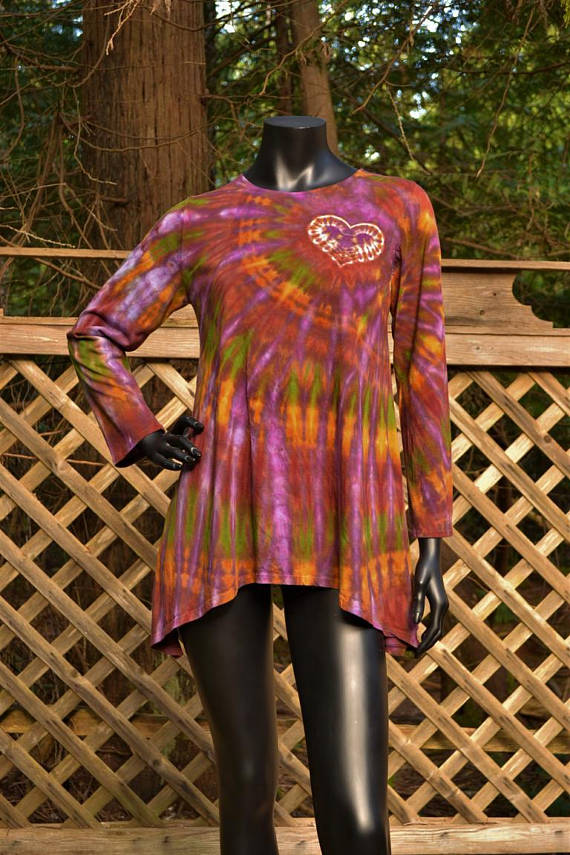 These 100% 6.5oz Jersey cotton asymmetrical tie dye long sleeve tunics have a pretty boat neck and flatteringly flow away at the hip.