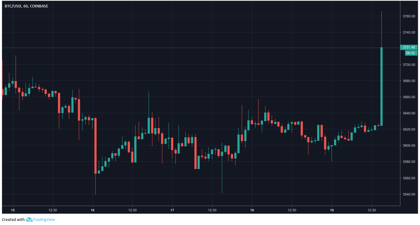 The one-hour chart for bitcoin shows that the price candle opened at 10:00 AM UTC [3:30 IST], and 15mins later, the prices jumped from $3,624 to $3,728, at the time of writing.