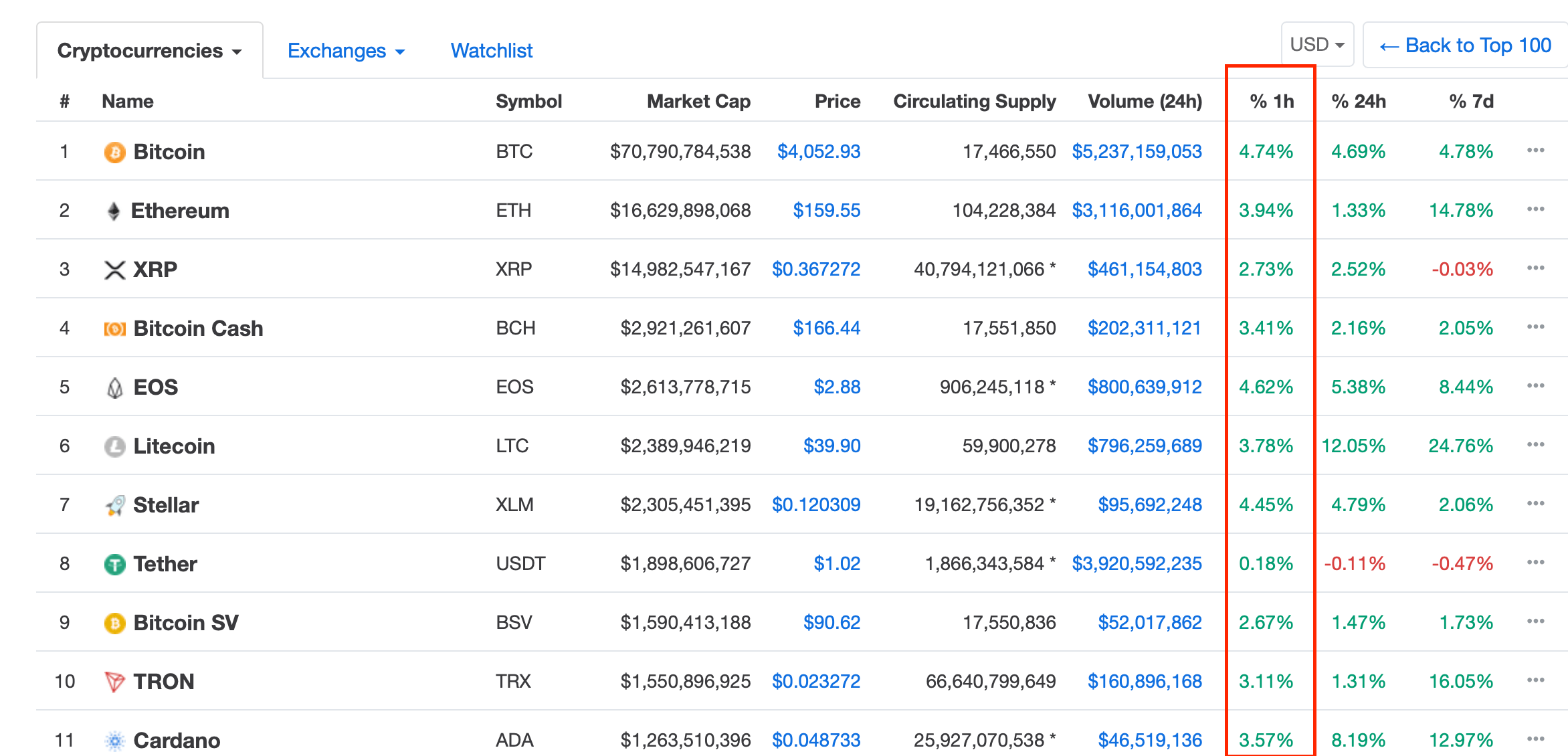 The one-hour jump pumping everything from BTC, Ethereum, XRP and other altcoins