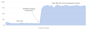 The Chromium Blog confirms that mining scripts consume significant CPU resources and impact system performance and power consumption. Illustrating CPU overutilization from hidden coin mining in an extension is the chart below: