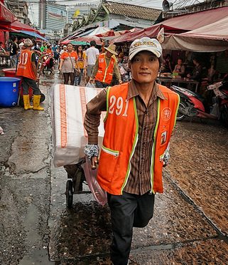 Hard at work in the market on a rainy summer day