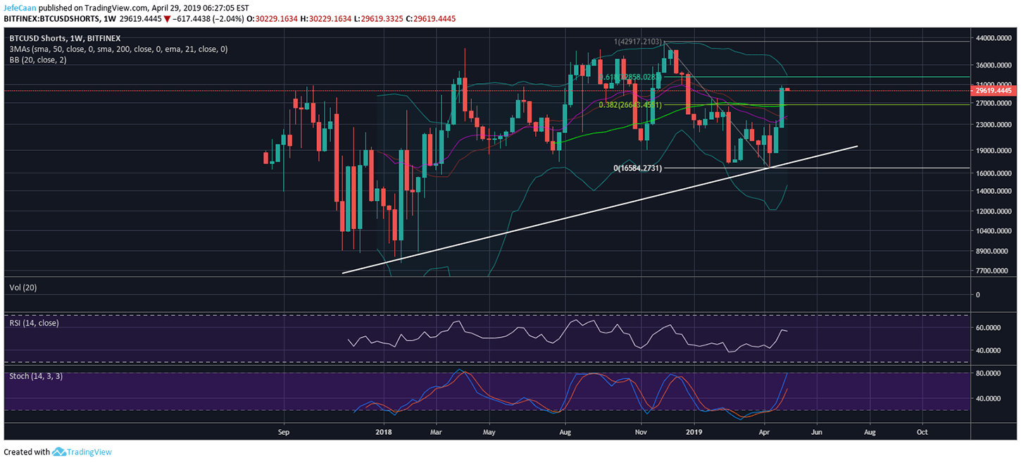 The weekly chart for shows the state of bearish euphoria. The number of margined shorts has been up dramatically for the past two weeks. The weekly RSI for BTCUSDShorts is now close to overbought territory. While this does not mean that /USD cannot fall further or BTCUSDShorts cannot keep on rising, it does mean that entering a short position at this point is now very risky. The whales have the opportunity to stage a short squeeze that would lead to a big pump in the price of () on the backs of dead bears that will be forced out of their positions as their stops are hit. Both the bulls and the bears are going to fight hard at this level as the fate of () for the months and years to come depends on it.