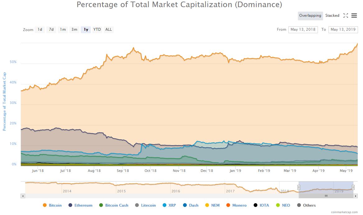 bitcoin has outshined its competitors throughout the 2019 cryptocurrency recovery, enabling BTC to surge to its most dominant market position since December 2017. As of the time of writing, bitcoin and its $137.1 billion valuation retained a 60% on the entire crypto market cap.