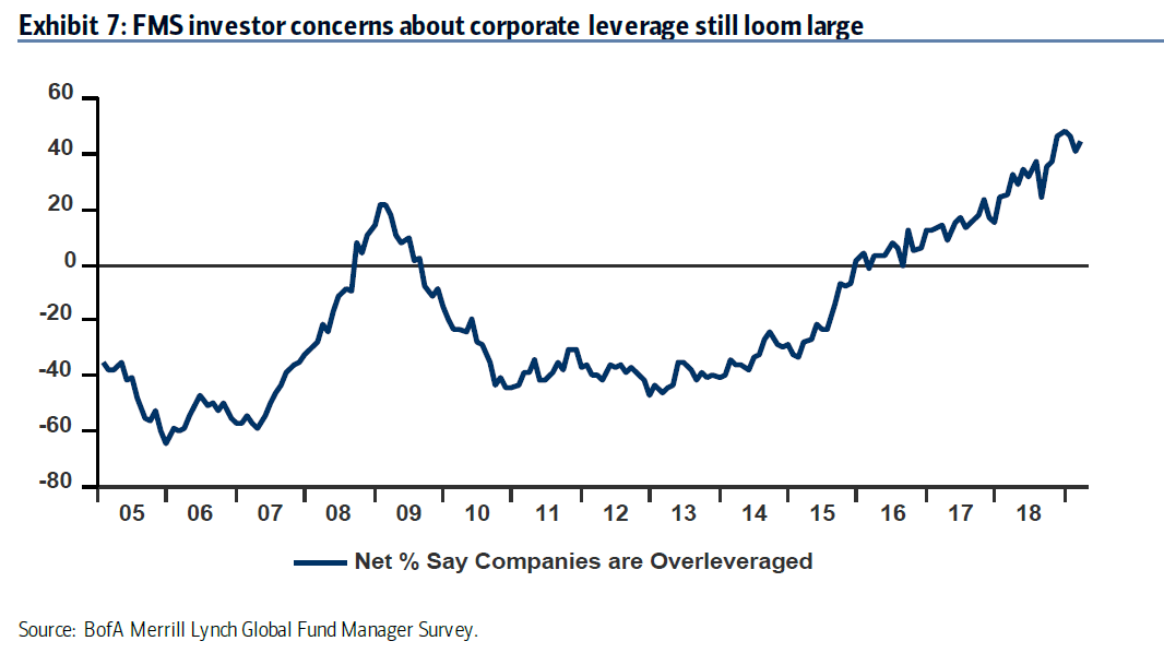 Credit is still the biggest concern for fund managers as the survey found that 44% of believe corporations are now excessively leveraged, while 43% think corporates should “improve their balance sheet.”
