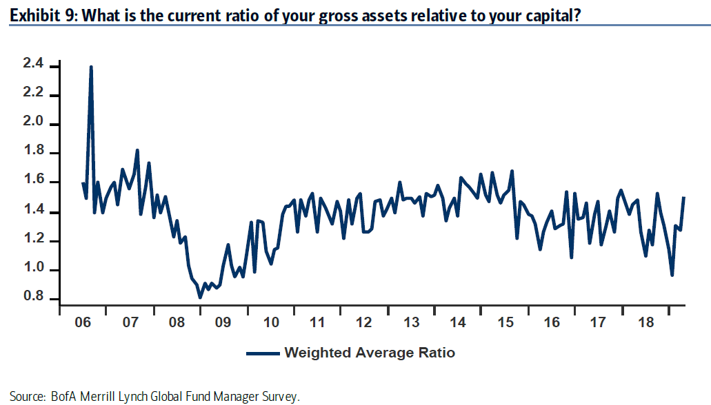 BofAML found that fund managers’ cash levels were essentially flat month over month, right around the 10-year average of 4.6% and just above neutral. The firm’s survey also indicated that hedge funds have started to chase the rally. Gross assets relative to capital rose to 1.51 from 1.28 in March. It’s the highest level since September.
