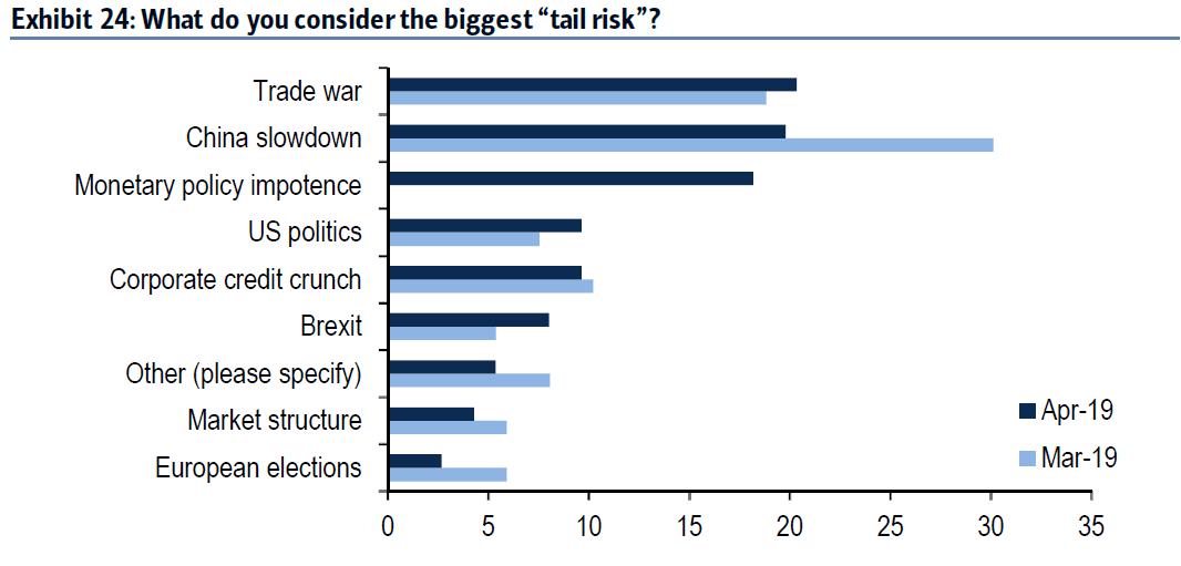 Even though investors aren’t expecting a soon, they’re also not looking for a boom. They named the top two tail risks as the ongoing trade war and the slowdown in . Both of those risks are holding growth expectations lower.
