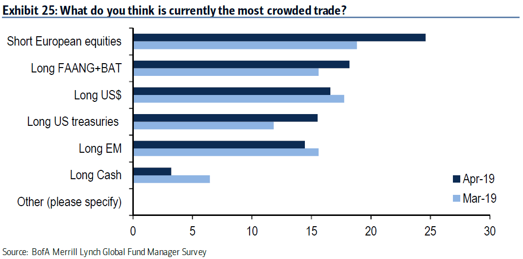 Additionally, Hartnett describes positioning in equities and as “well-below normal,” adding that the most crowded trade is still considered to be shorting European stocks. This is the second consecutive month in which short European equities is the most crowded trade.