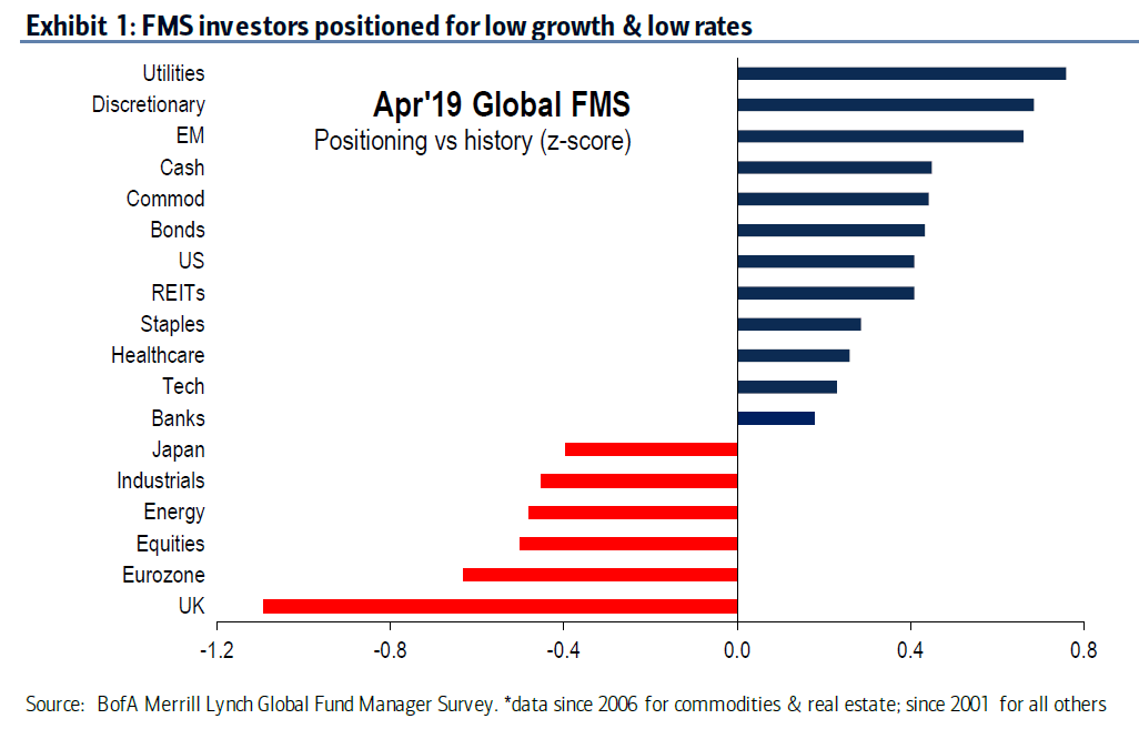 Bank of America Merrill Lynch analysts released their latest Global Fund Manager Survey this week. Chief Investment Strategist Michael Hartnett and team said fund managers are positioned for “secular stagnation,” meaning they’re long assets that do well when growth and rates are down, such as cash, and utilities. Fund managers are also short assets which thrive in higher interest rates and higher growth, such as equities, banks and the Eurozone.