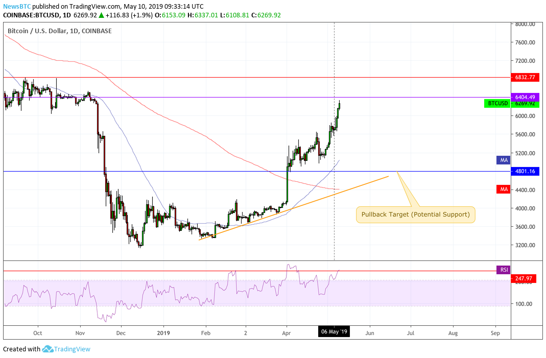 These cases offer plenty of evidence about traders’ behavior whenever the weekly RSI pops above 70. They can be applied to the current scenario, considering a pullback sentiment above $6,400 is also high. The dual technical factors could prompt bitcoin to begin at least a 24.95 percent correction to the downside, which will bring the price to a $4,804 – more or less.