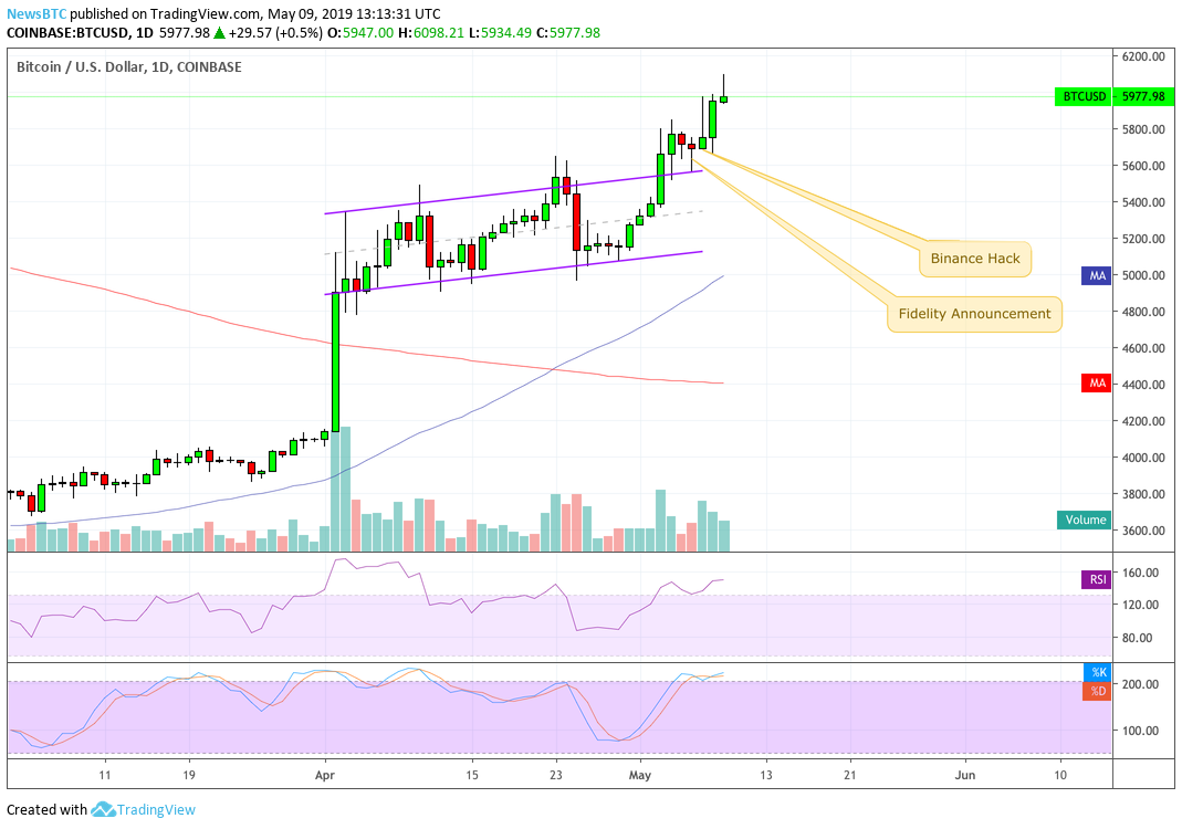 The Boston-based asset management firm, which is famous among its peers at Wall Street, announced that it would buy and sell bitcoin for its clients within a few weeks. The announcement went to the wire on May 6, the day when the bitcoin price was going through a minor downside correction upon a reversal action from $5,846, a session high established two-days earlier. The news of Binance losing about $40 million worth of bitcoin in a hack went live on March 7. Nevertheless, the bitcoin price reacted more to the positive aspect of the day and rose as much as 4.98-percent on Coinbase.