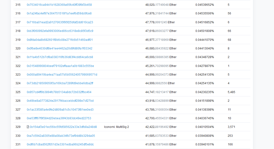 Addresses on the Ethereum blockchain which contain around 45,000 Ether. As you can see, few have “thousands” of transactions.
