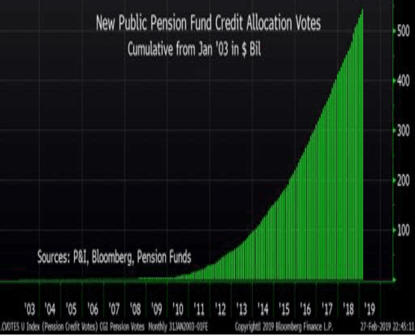 Given that public pension funds are now the dominant investors around the globe, and the fact that agencies are scrambling to raise taxes to catch up on massive , he expects the credit boom to continue at least a few more years.