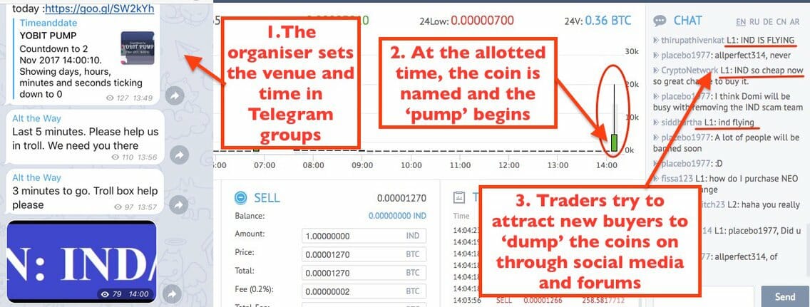 On various social media channels, for example Telegram, BitcoinTalk and Reddit, groups of individuals come together and agree to buy altcoins at a certain price and to sell simultaneously at a specific time when the price peaks. They often spread false or misleading information to persuade unsuspecting investors to buy during the run-up.