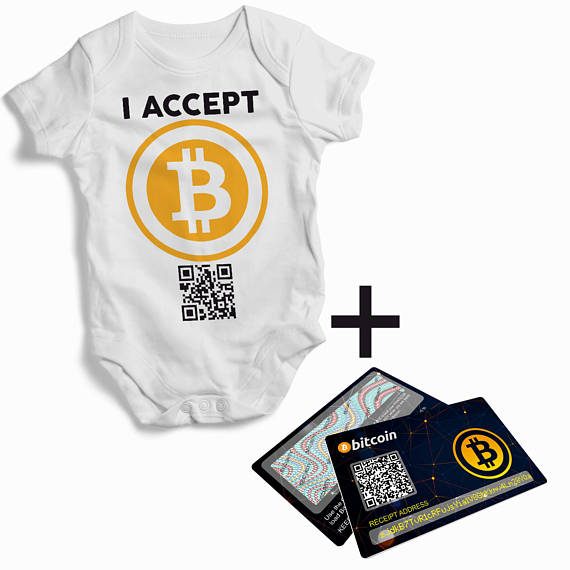 Baby bodysuit + plastic card wallet with instruction how to load and unload your baby crypto currency.
