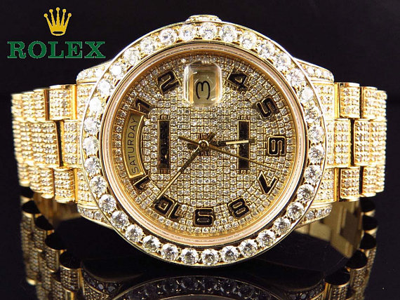 Important 15Ct. Iced Out 18kt Gold Rolex Day Date President 18038 Champagne Diamond Dial Wristwatch, Style No. 18038, circa 1989, automatic signed single quickset Swiss movement, water-resistant type-Oyster case with screw-down crown and case back, Rolex insignia crown, custom fitted with a 5.5 Ct VS2-SI1 clarity diamond bezel with a total diameter of 41 MM, scratch resistant sapphire crystal, gorgeous pave set champagne diamond dial with bold Arabic numeral hour designations, baton hands, sweep center seconds, sweep center seconds, day aperture at the 12 o'clock position, cyclops calendar aperture at the 3 o'clock position, signed integrated link 18k Rolex President band with insignia folding clasp rapid deployment band completely covered in stunning brilliant pave set single cut diamonds, with 15.0 ct. of diamonds in total weight. Just serviced the watch keeps excellent time looks extremely handsome on the wrist and comes with the Rolex presentation boxes, tags and $54,000 insurance replacement value certificate of authenticity COA, and would make a stunning gift and impressive addition to any fine collection.