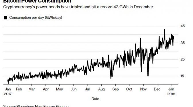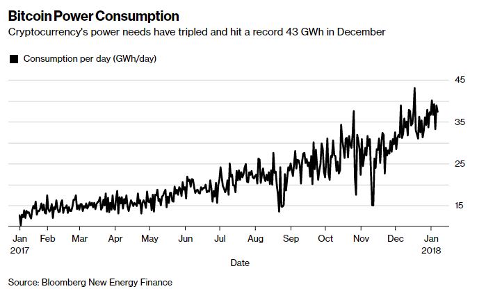 According to Bloomberg, the bitcoin mining industry’s collective power consumption tripled in 2017, reaching a peak daily usage of 43 GWh in December.