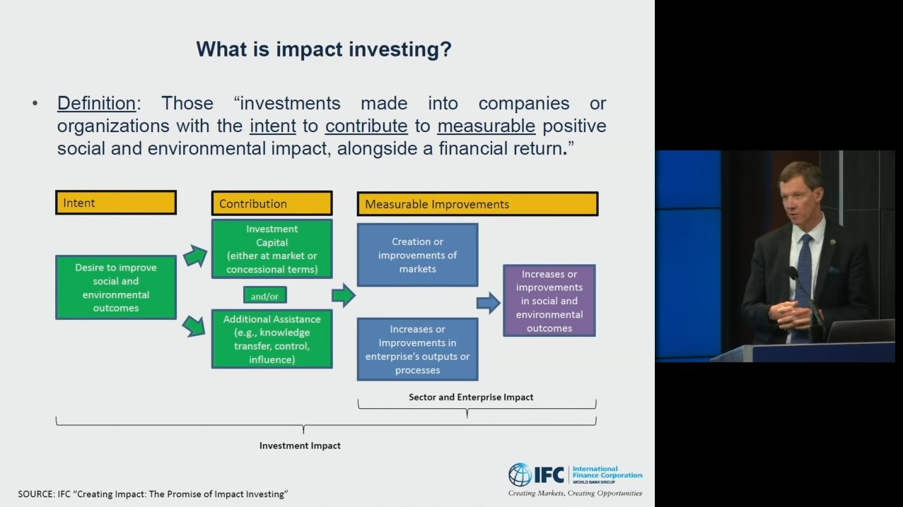 Good morning everybody and thank you for the opportunity to share with you some of the main findings of this report creating impact and whenever we start to talk about impact investing we need to ensure that we’re starting from a common understanding of what we mean by the term. It’s a label that is commonly used but sometimes people are confused between what is sustainable investing versus versus other types of investing. So we use this a definition which we believe is commonly accepted across the industry. And this is a definition which describes three things that impact investors do differently from other investors. Firstly they have an intent to create social and environmental improvements through their investments. Secondly they make a contribution to the achievement of those improvements either through the capsule they provide or other forms of value they provide to the companies. So already we can see this goes beyond just investing in companies which have impacts and impact investing actually has a thesis for how that investment makes a difference to the company’s ability to impact. And thirdly impacts investors measure what they do and measure the improvements that they make to impact just as they would on the financial side measure their financial returns. And that can be at the level of the company in the project so it can be the level of the systemic change which they make at market level which is something that in our new framework that IFC now attaches more attention to so using this definition whether it’s the size of the market today.