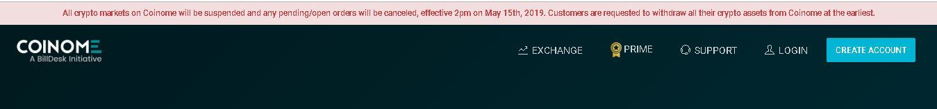 “All crypto markets on Coinome will be suspended and any pending/open orders will be canceled, effective 2pm on May 15th, 2019. Customers are requested to withdraw all their crypto assets from Coinome at the earliest.”