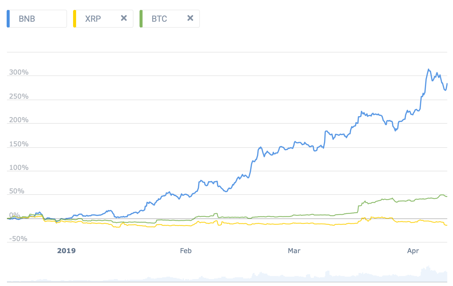 XRP’s year-to-date performance compared to bitcoin and biggest-gainer Binance Coin. | Source: CoinCodex