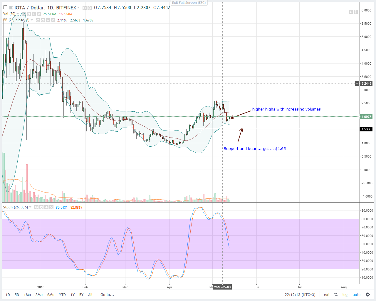On the chart, IOTA is reacting positively to price action and volume injection. With a break below accumulation in the 4HR chart and higher highs in the daily chart complete with a stochastic buy signal in the weekly chart, IOTA might bounce higher today. As such, aggressive traders can take longs today with stops at May 12 lows of $1.5. Conservative traders on the other hand better take longs only when buyers are trading above $2.2 or the middle BB.