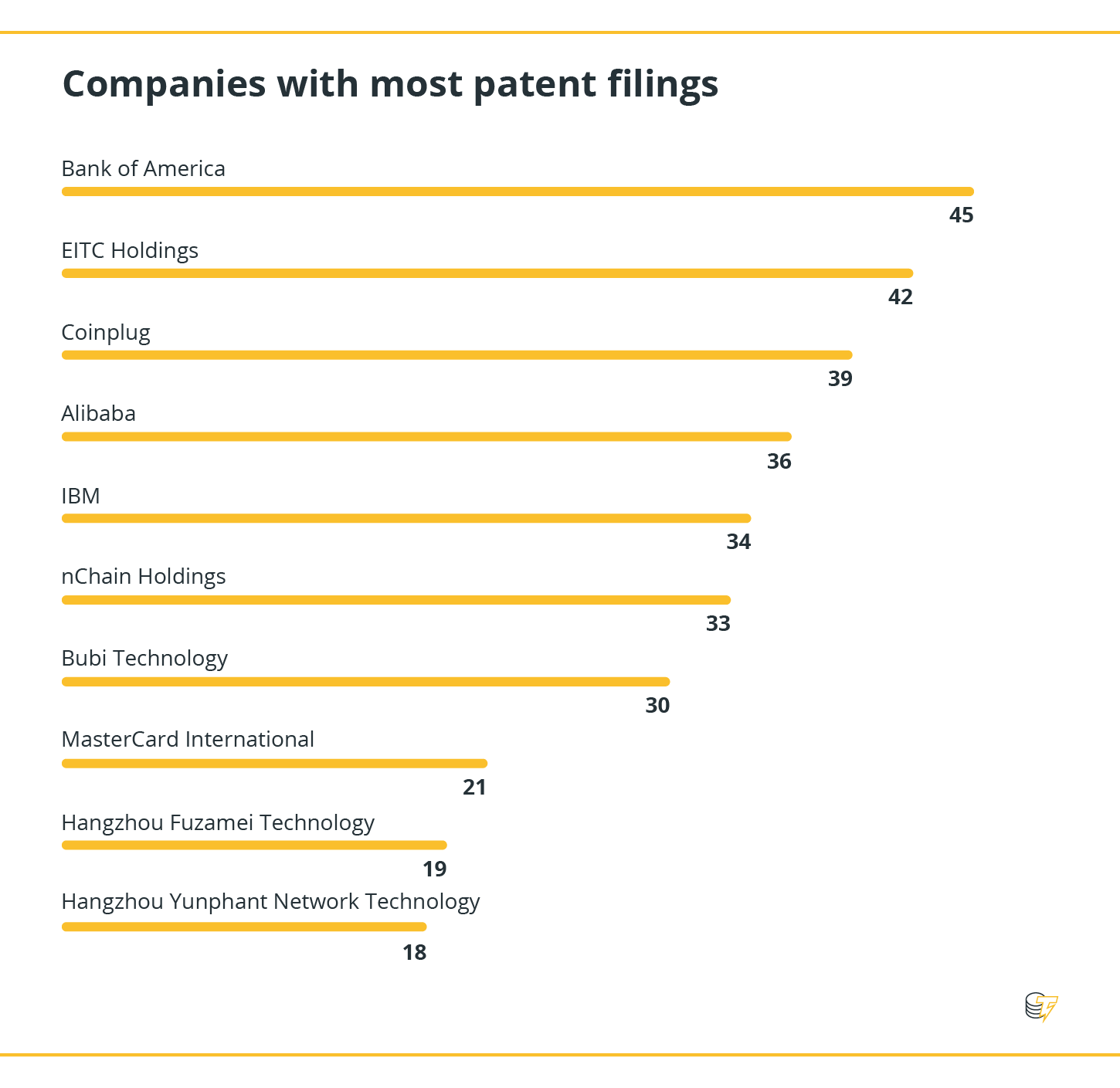 The majority of international blockchain patents applications are filed by EITC — also known as nChain — Bank of America, Alibaba, Coinplug and IBM, according to .