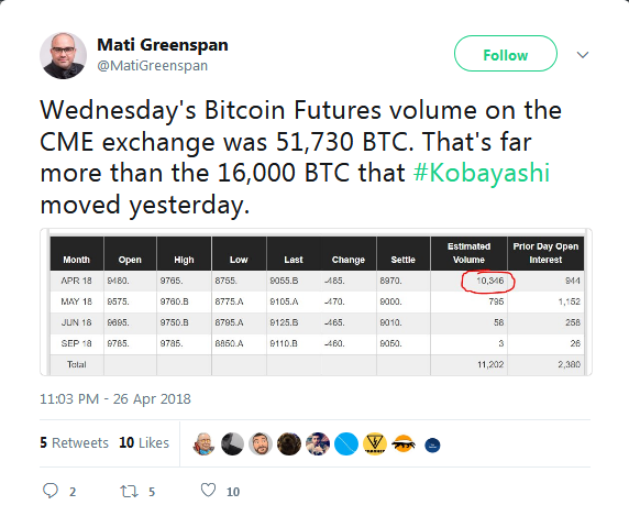 In a related development, a by Greenspan showed that the CME bitcoin futures volume for April 25 was 51, 730 BTC. This is significantly higher than the 16,000 BTC moved by Kobayashi. bitcoin has been enjoying a resurgence of late, posting its first back-to-back weekly gains for 2018.