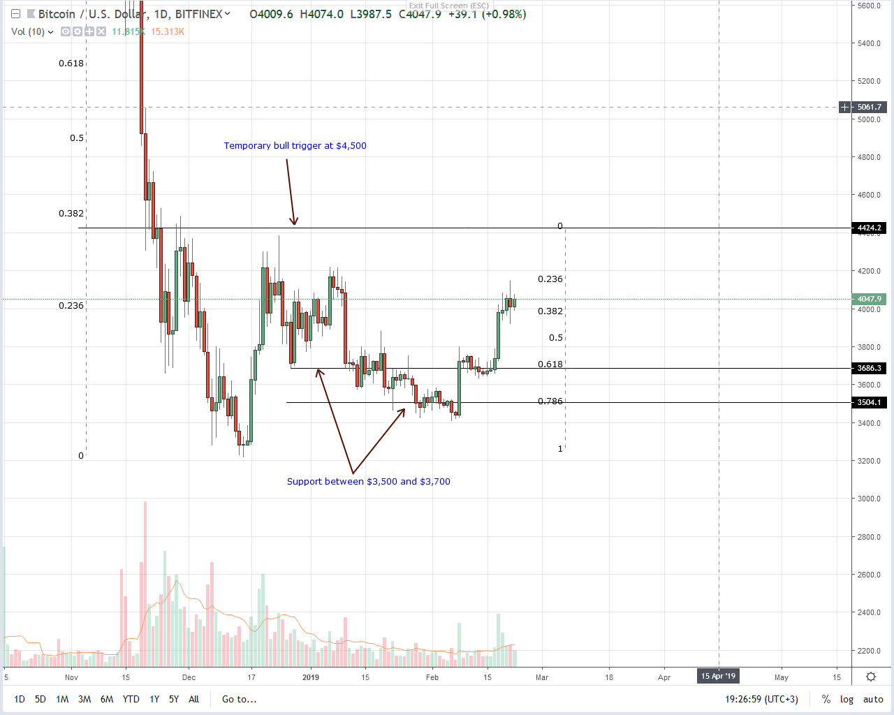 Encouragingly, market participation is on the rise according to data from BitFinex. Average daily volumes are up from 10k registered on Feb 6 to 15k of Feb 21. We expect this trend to continue as BTC prices expand towards $4,500. Ideally, any break above $4,500 should be at the back of high volumes exceeding Feb 18’s 37k.