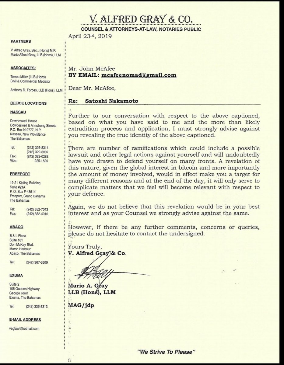 “The US extradition request to the Bahamas is imminent. I met with Mario Gray, my extradition lawyer, and it is now clear (read his letter below) that releasing the identity of Satoshi at this time could influence the trial and risk my extradition. I cannot risk that. I’ll wait.”