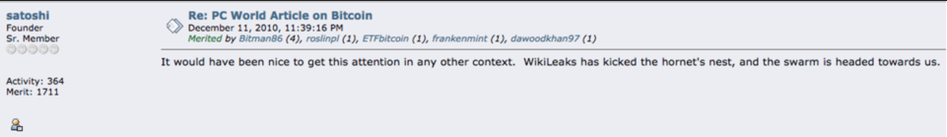 Wikileaks started accepting bitcoin as early as 2010 as soon as Assange understood what the currency was capable of. Though Wikileaks was in the limelight for the wrong reasons, it did help bring bitcoin into the open. Such was the influence Wikileaks had that Satoshi Nakamoto himself commented on what Wikileaks accepting bitcoin meant for the cryptocurrency ecosystem. In a from his now inactive account, he said,