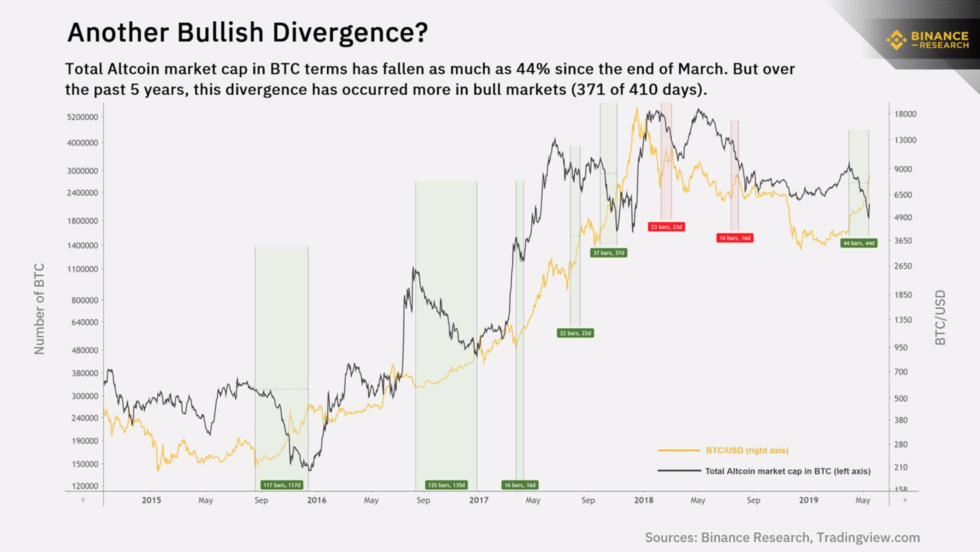 In fact, bitcoin 00 has been pretty healthy since the end of March, thank you very much. In fact, over the last 44 days the total altcoin market cap has fallen as much as 44% in BTC terms. This has caused a bullish divergence for bitcoin, where price was rising but altcoins fell behind in BTC terms.