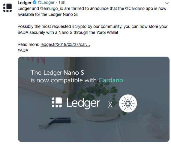 After weeks of speculation, Cardano [ADA] was integrated on the cryptocurrency hardware wallet, Ledger. As announced by an on 27 March, the tenth largest cryptocurrency on the market will be added to the upcoming Ledger Nano S.