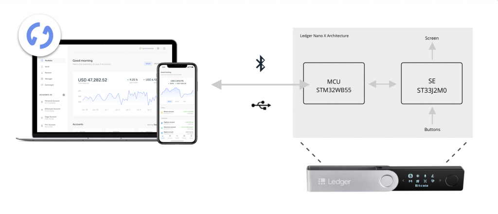 For instance, when you make a transaction, the transaction is prepared on the smartphone or desktop Ledger Live application and then sent using Bluetooth or USB to the MCU (STM32) which directly relays it to the Secure Element. You are then prompted to verify the amount and the address of the recipient, which are displayed on the screen. If everything is correct you can approve the transaction by pressing both buttons.