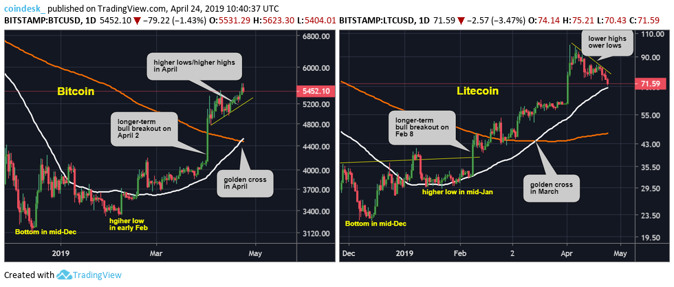 bitcoin (BTC) could be in for a sudden price pullback, as litecoin (LTC), which doubled in value in the first quarter and led the crypto markets higher, is now showing signs of weakness.