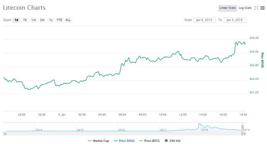 LTC trading at $32 on January 4, 2019, UTC took a downturn and fell as low as $31. The prices didn’t stay there but rose up in a short-term rally causing the prices to increase back to the prior level.