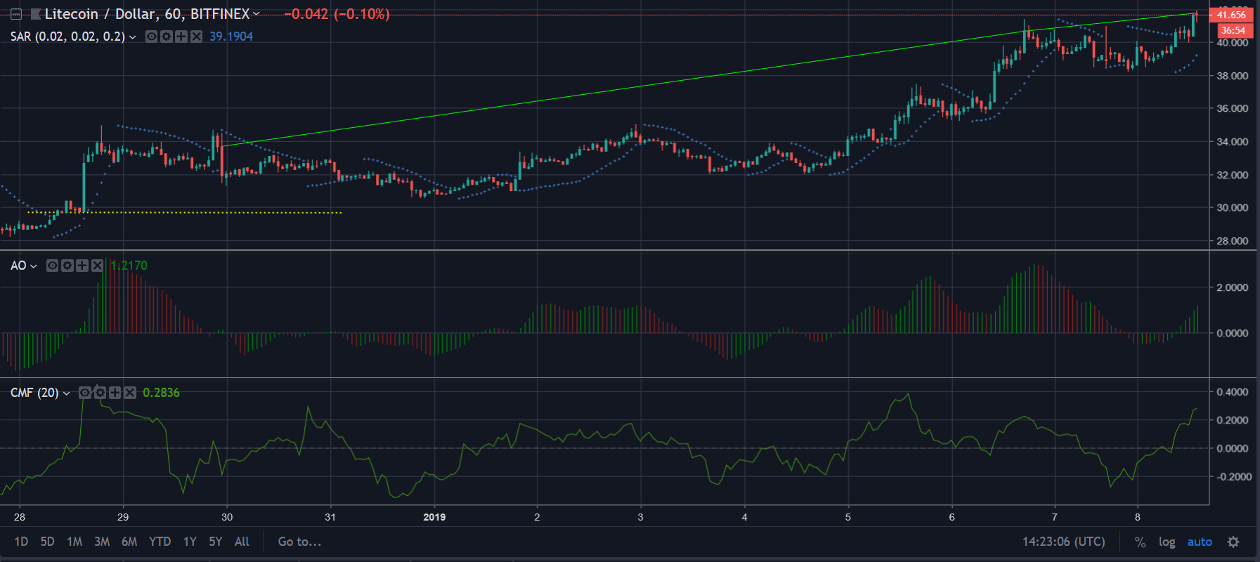 The Awesome Oscillator is demonstrating a bullish trend for LTC as the green spikes are picking up the momentum right now.