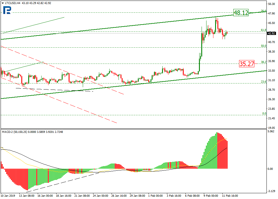 On H4, the price made an upmove after a long downtrend and then a convergence. The coin approached 76% Fibo, while the uptrend stopped near the upper channel boundary, which means a reversal may be near. The new short term move may still make a new high reaching 76% Fibo, or $48.12. The support is meanwhile at $35.27.