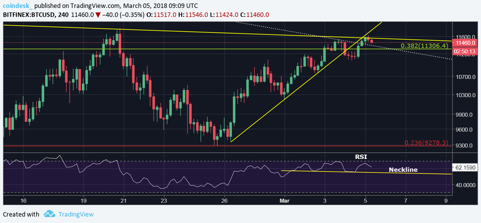 Having clocked a high of $11,599 earlier today, bitcoin is now trading at $11,473, according to CoinDesk’s (BPI). While the cryptocurrency has spent the better part of the last 42 hours above $11,000, a convincing break above the key resistance level of $11,600 (inverse head-and-shoulders neckline) has remained elusive amid lighter trading volumes.
