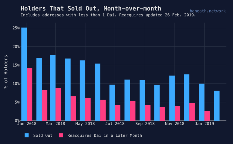 Based on MakerDAO’s data, the gap between DAI holders who sold out their positions and those that return to purchase DAI later that same month (presumably to pay off loans), is widening in 2019.