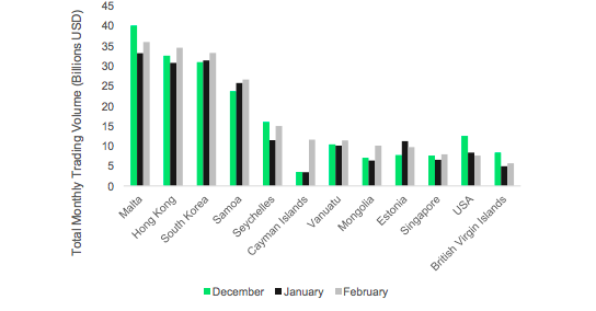 The country-wise analysis further pointed to an increase in the monthly-trade volume by 8 percent since January for Malta alone. In the same period, Hong Kong and South Korean exchanges saw a bump of 12 percent and 6 percent, respectively.