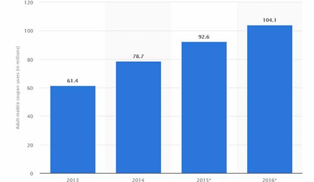 According to Statista, the number of mobile coupon users in the US rose from 61.4 million in 2013 to about 104 million in 2016. This is a growth of about 70% in three years.
