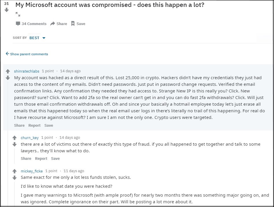 A Reddit user called Shinratechlabs says he lost “25,000 in crypto,” as a result of the Microsoft data breach, but did not provide further details. He’s disgusted at how easy it was for a hacker to illegally gain control of his Microsoft account.