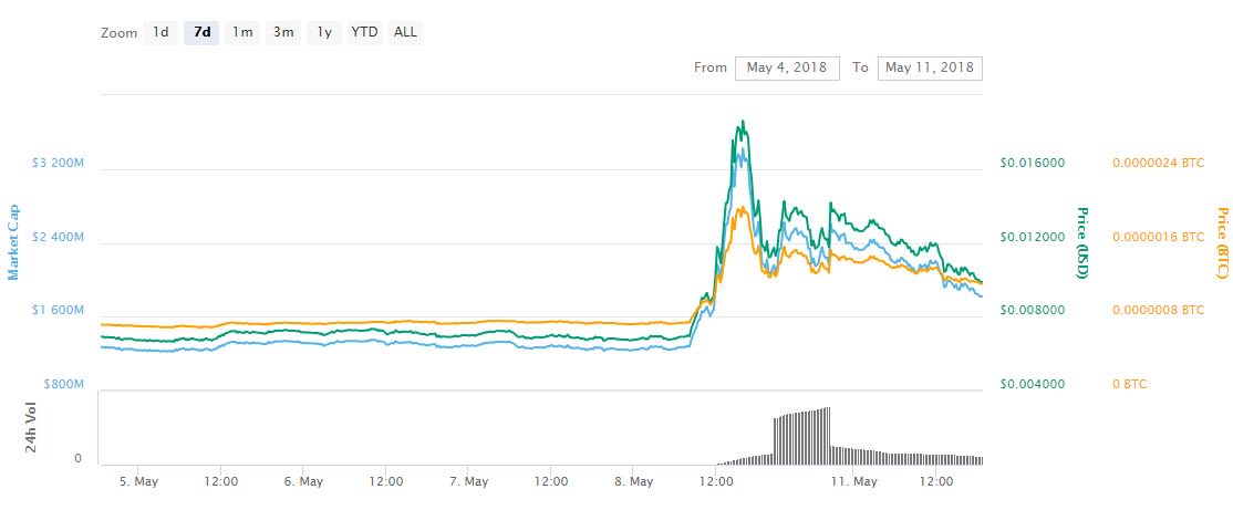 As of writing, BCN is changing hands at $0.010 – down 46 percent from record highs, but still reporting a 35 percent week-on-week rise.