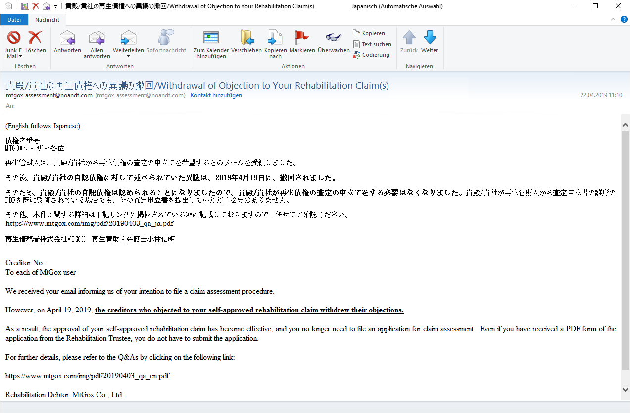 In an email dated April 22, 2019, sent to all Mt. Gox users, the exchange revealed that the “self-approved rehabilitation claim” became active following the withdrawal of objections by creditors to the said claims. The statement read,