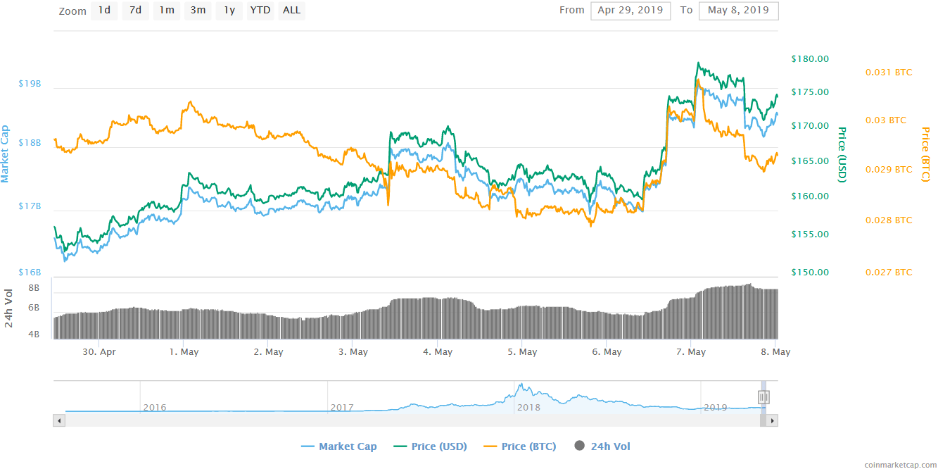 Between April 25th and May 8th, the unit value of ETH increased from $153.48 up to a peak of $180.39. A brief pullback saw it returned to the low $170 range, but momentum pushed it higher once more.