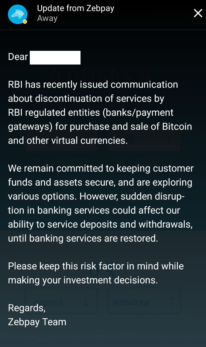 The two popular exchanges in are Unocoin and ZebPay. After the news of RBI’s decision to bar banks from interacting with cryptocurrency entities, Cointelegraph contacted ZebPay for comment, but has not received any response. The only mode of communication with its users was e-mail as well as a notice that appeared on their mobile app.