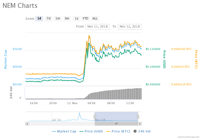 NEM is 17th on the current list of tokens by market capitalization. It hit a high of $0.114 overnight, but currently sits about .007 less than that, at time of writing being worth $0.107375, marking a 16 percent gain. It beats out notable contenders like zcash by hundreds of millions of dollars.
