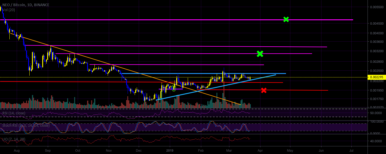 The overall on NEO looks healthy. It’s declined a bit, now that we’re nearing the end of the triangle. Obviously, if decides to test some lower levels, NEO may break down the uptrend, so caution is needed.