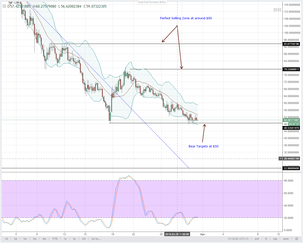 From price action and patterns, we shall place our upper limit at $135 and that’s where sellers should get in say there is a pump before a drop towards $100 in the coming session.