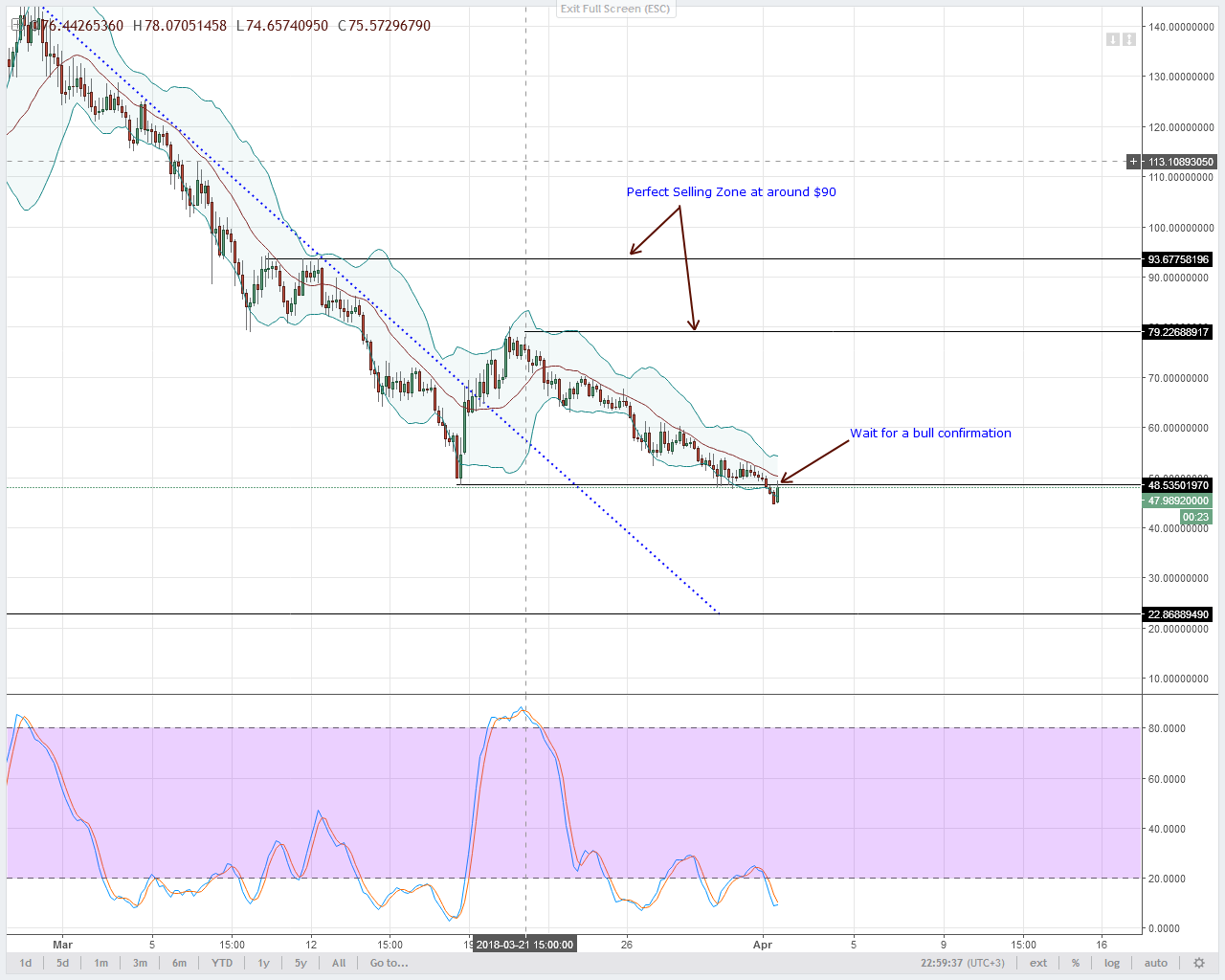 As Q1 2018 comes to an end, the bear sores are the only thing tokens have to show. Fundamentally, this token should find support mainly because of . This launch is one of the hallmarks of EOS and as it is on its awesome road map, it would show the capability of EOS to support DApp of a commercial level without congesting the platform. If it works as advertised, it should draw some demand especially from developers who might flock and drive the value up.