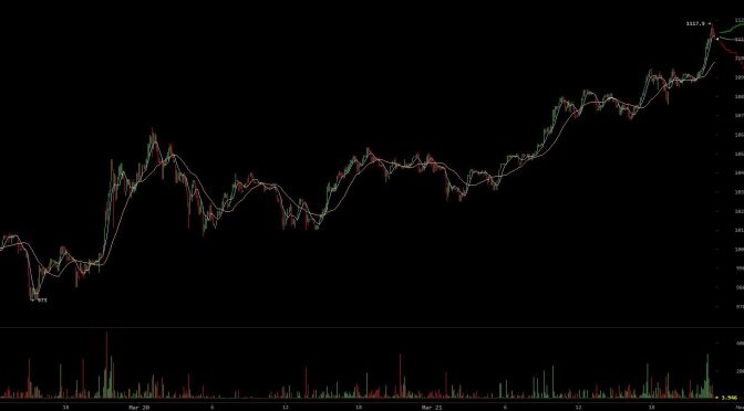 At the time of publishing, bitcoin is trading to the dollar at a $1,113.